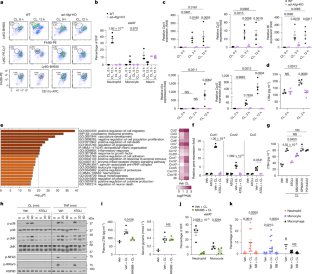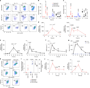 a. Representative flow cytometry plots (CD45 + CD11b+Thy1.2-CD19- cells) and quantification of each cells in spleen from diphtheria toxin (DT, 20 µg kg−1) treated Neu-WT and Neu-DTR mice 12 h after CL injection (0.5 mg kg−1). (Neu-WT: n = 8; Neu-DTR: n = 10). Quantification of cells in bone marrow 24 h after DT injection. (n = 3 per group). P values Neu-WT vs Neu-DTR. b. Serum NEFA and IL-6 in DT-treated mice after CL injection. (glycerol, 0 h: n = 3,4; 2 h: n = 6; 12 h: n = 10,7; 24 h: n = 6,10. IL-6, 0 h:n = 3,2; 2 h: n = 4,3; 12 h: n = 9,7; 24 h: n = 6,9). P values Neu-WT vs Neu-DTR. c. Inflammatory genes in eWAT (Adgre1) or iWAT (IL-1β, IL-6) from DT-treated mice 12 h after CL injection. (CL 0 h: n = 3,4; CL 12 h: n = 7,8. normalized to Neu-WT 0 h). P values Neu-WT vs Neu-DTR. d. IL-1β levels in supernatants from WT PPDIVs treated with CL-316,243 (1 µM, 12 h) or LPS (0.5 µg ml−1, 12 h), followed by ATP (5 mM, 1 h). (n = 2 per group). e-f. (e) Body weight and (f) food intake from DT-treated mice at indicated time points or 6 h after final CL injection. (CLx2: 2 days; CLx7: 7 days). Food intake was measured for 24 h before and after CL injection. (f, n = 6 per group). P values indicate comparisons between Neu-WT and Neu-DTR. g. Tissue weight of eWAT 6 h after second CL injection with or without DT. (n = 3,4 per group). P values Neu-WT vs Neu-DTR. h. IL-1β levels in eWAT from WT mice after CL injection for the indicated times (CL x2: 2 days injection). (0 h, 6 h: n = 4; 12 h, 24 h: n = 5; x2: n = 6). P values vs 0 h. i. IL-1β levels in eWAT from DT-treated mice 1 h after second CL injection. (CL 0 h: n = 2; CL x2: n = 4). P values Neu-WT vs Neu-DTR or relative vs 0 h. Data are mean ± s.e.m. Each dot (n) represents one biological replicate. Data are merged from three (a, b, c, h) or representative of two (d, f, g, i) independent experiments. Statistics: two-way ANOVA with Sidak’s post hoc test (a (bone marrow), b, c, e, f, g, i); one-way ANOVA with Tukey’s (h); unpaired two-sided Welch’s t-test (a).