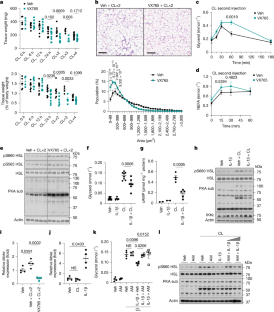 a. Immunoblots of eWAT from WT mice 12 h after CL-316,243 injection (0.5 mg kg−1) with vehicle or VX765 (50 mg kg−1, twice per day) or IL-1β levels in eWAT from WT mice 3 h after the second CL injection (0.5 mg kg−1 day−1) with vehicle or VX765. (n = 4 per group). P values vehicle vs VX765. b. Chemokines and LTB4 levels from WT PPDIVs pretreated 30 min with VX765 (40 µM), followed by CL-316,243 (1 µM, 3 h). (veh: n = 3, VX765: n = 2, CL: n = 4; VX + CL: n = 3)). P values vehicle vs VX765. c-e. (c) Serum NEFA and glycerol, (d) IL-6 levels and (e) body weight, iWAT tissue weight after CL injection with vehicle or VX765 for the indicated times (CLx2-4: 2-4 days) (NEFA, 0 h/6 h/12 h: n = 4; 24 h: n = 8,7. Glycerol, 0 h: n = 3; 6 h: n = 7). P values vehicle vs VX765. f. Paired serum glycerol levels from the same mice at 30 min and 1 h after the second CL injection with vehicle or VX765 for the indicated times (n = 8 per group). P values 30 min vs 1 h. g. Analysis of DT-treated mice after the second CL injection. Serum glycerol and immunoblots of eWAT from 15 min after second CL injection. (0 min: n = 5,4; 15 min: n = 6,5; 30 min: n = 7,5; 60 min: n = 6,5). P values Neu-WT vs Neu-DTR. h. Glycerol release from ex vivo cultured eWAT of WT mice. eWAT was collected 24 h after CL injection with vehicle or VX765. Then treated in culture with vehicle or CL-316,243 (1 µM, 30 min). (0 h: n = 6,5; 0.5 h: n = 6,5). P values vehicle vs VX765. i. Fatty acid oxidation genes in both eWAT and iWAT 3 h after the second CL-injection with vehicle or VX765. (veh: n = 7,8; VX: n = 7,8). P values vehicle vs VX765. j-k. WT PPDIVs were pretreated 18 h with IL-1β (5 ng ml−1) or vehicle, followed by CL-316,243 (1 µM, 0.5 h). (j) Immunoblots and (k) glycerol release and fold change compared to vehicle or IL-1β. (n = 4 per group). P values vs groups. l-p. Genes expression in (l) 3T3-L1 adipocytes or (m, p) WT PPDIVs treated with IL-1β (5 ng ml−1, 3 h) or CL-316,243 (1 µM, 3 h) or TNFa (5 ng ml−1, 3 h). (veh: n = 2, IL-1β: n = 3, TNFa: n = 2; CL: n = 3). P values vs vehicle. n. Beta 3 adrenergic receptor gene in eWAT from WT mice 3 h after the second CL injection with vehicle or VX765. (n = 4 per group). P values vehicle vs VX765. o. Beta 3 adrenergic receptor gene expression in eWAT from DT-treated Neu-WT and Neu-DTR mice 6 h after the second CL injection. (n = 3,4 per group). P values Neu-WT vs Neu-DTR. Data are mean ± s.e.m. Each dot (n) represents one biological replicate. Data are merged from three (c-d), two (f-i) or representative of two (a, b, g (blot), j-p) independent experiments. Statistics: two-way ANOVA with Sidak’s post hoc test (c, d, g, h); two-way ANOVA with Fisher’s (e); one-way ANOVA with Tukey’s (b, n, o); Welch’s one-way ANOVA with Dunnett’s T3 (b (cxcl1), k); unpaired two-sided Student’s t-test (f); unpaired two-sided Welch’s t-test (a); two-sided Mann Whitney U test (i).
