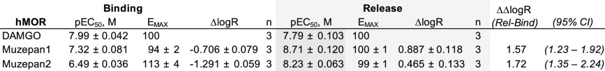 1. Pharmacological parameters are presented as the mean pEC50 and EMAX (% DAMGO max) and ΔlogR (DAMGO reference) determined from the mean of individual curves with the number of replicates and error as indicated (n). The mean of the ΔΔlogR with 95% CI is presented and determined by comparing ΔlogR values from GTP binding and release using an unpaired, two-tailed t-test.