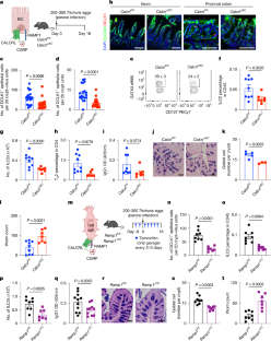 a-b, Calca and Calcb expression were assessed in sorted ILC2s (n = 5), Th2 cells (n = 3), purified DRGs (n = 6), and intestinal muscularis layers (n = 6) from wild-type B6 mice on day 17 post Trichuris infection. c, Schematic of nociceptor silencing during Trichuris infection. d, Schematic of RTX-mediated nociceptor ablation and Trichuris infection. e-f, Representative images (e) and tuft cell quantification (f) from mice treated with DMSO (n = 7) and RTX (n = 7). DAPI (blue), EpCAM (green), DCLK1 (red). Scale bar=50 µm. g-i, Representative flow cytometry plots (g), frequency (h) and total number (i) of Lineage– GATA3+ ILC2s in mLNs from mice treated with DMSO (n = 4) and RTX (n = 5). j, Frequency of GATA3+ CD4+ T cells in mLNs from mice in g-i. k-l, Representative histology and goblet cell quantification of the proximal colon by AB-PAS staining from mice in g-i. Scale bar=50 µm. m, Trichuris worm counts from mice treated with DMSO (n = 7) and RTX (n = 7). Data are representative of 2 independent experiments (h-j, l) or pooled from 2 (a, b, f, m) independent experiments. Data are mean ± s.e.m. Statistics were calculated by two-way ANOVA test (a, b) or unpaired two-tailed t-test (f, h-j, l, m). The illustrations in c–d were created in BioRender. Emanuel, E. (2025) https://biorender.com/b1xymo3.