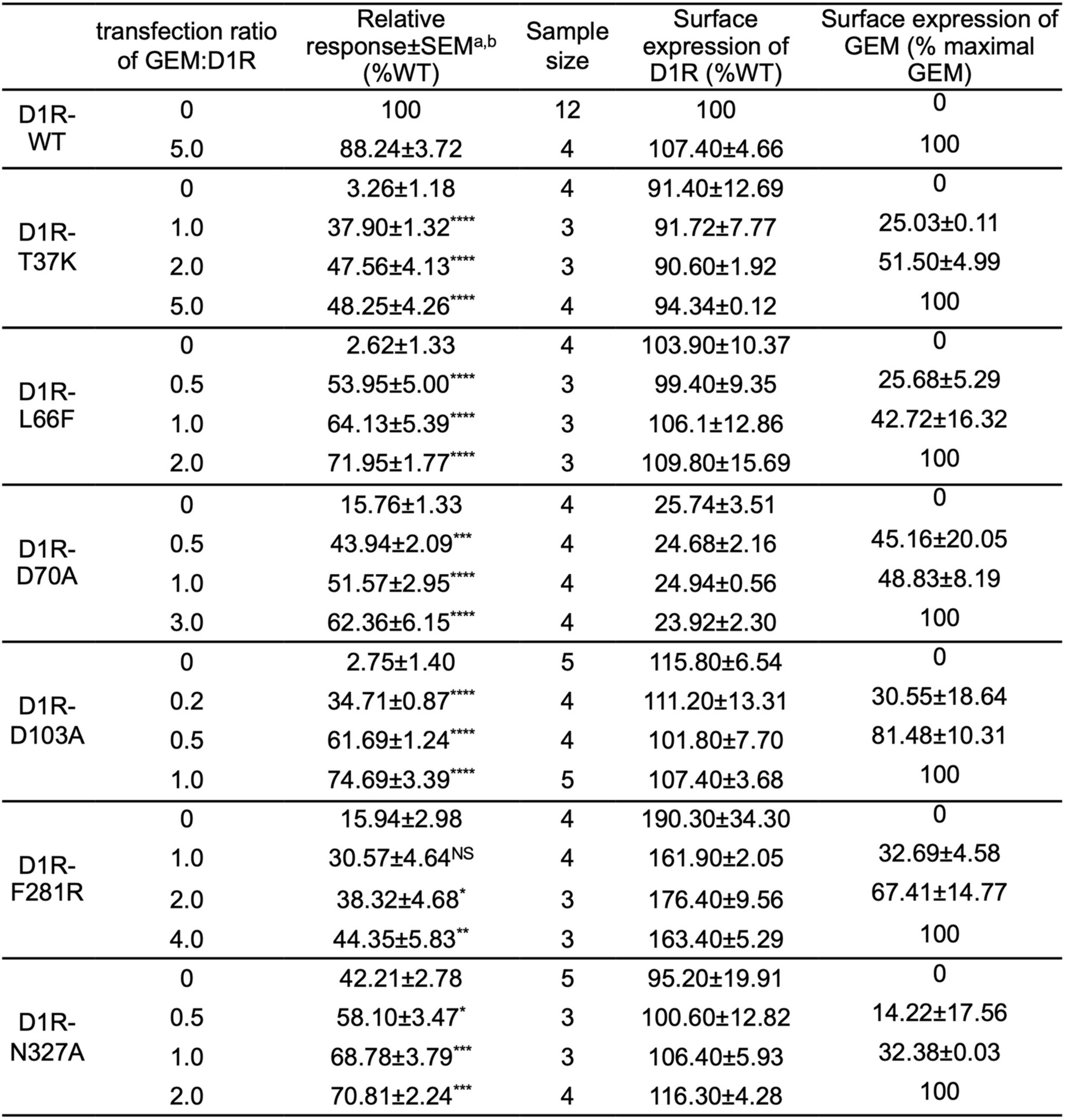 1. aGloSensor results of cAMP accumulation for D1R (WT, mutant and GEM binding) were normalized to the maximal response of WT D1R. Data are presented as means ± SEM from at least three independent experiments performed in technical triplicate. NSP > 0.05, *P < 0.05, **P < 0.01, ***P < 0.001 and ****P < 0.0001 by one-way ANOVA followed by Dunnett’s post-test comparing each mutant to its corresponding D1R control without GEM (P < 0.0001, <0.0001, <0.0001, <0.0001, <0.0001, <0.0001, = 0.0004, <0.0001, <0.0001, <0.0001, <0.0001, <0.0001, = 0.0820, = 0.0150, = 0.0034, = 0.0148, = 0.0005, = 0.0002 from top to bottom).
