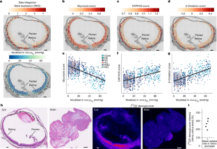 a, Modelled in vivo \({{p}}_{{{\rm{O}}}_{2}}\) mapped onto tissue sections. b-d, Tissue mapping of aggregated gene expression scores for genes associated with glycolysis, pentose phosphate pathway, and glutathione metabolism shows that glycolysis is not linked to redox metabolism (n = 4). e-h, This conclusion was supported by uniform expression patterns of SOD1, SOD2, CAT, and TXN. Expression levels of individual genes represent unitless variance-stabilized expression values, adjusted for sequencing depth across spots. Pathway scores are unitless enrichment scores calculated from the average expression of all genes in a pathway relative to a set of randomly selected control genes.