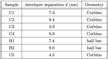 1. An extensive list of devices are measured in this work. This table provides important parameters for these devices, including the interlayer separation d as well as the sample geometry. Furthermore, we summarize the sample used for each data set in the following. Figures 1i, 2a-c, 3a-d, Extended Data Fig. 1a-e, and Fig. S4 are taken from sample C1. Figures 1g,h, 2e-g4a, Fig. S5, Fig. S8, Fig. S9, Fig. S10, and Fig. S12 are taken from sample H1, Figs. 3e, 4c,e, Fig. S3, and Fig. S6 are taken from sample H2. Figure 4d and Fig. S2 are taken from sample C5, which is the same sample used in refs. 37 and 17.
