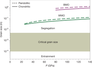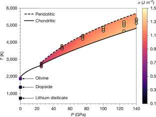 The symbols are the calculated results and the solid lines are the corresponding best fits. The dashed lines are adiabats of a cooling magma ocean of a chondritic bulk composition take from ref. 27. Overall, the nucleation rate at 140 GPa is around eight orders of magnitude higher than that at 115 GPa any time along the adiabat. Predicted grain sizes are sensitive to the assumed cooling rate. Values shown are illustrative for the chosen parameter sets and should not be interpreted as quantitative predictions.