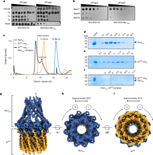 a, Sequence alignment of Rip1 homologues used in this study. Proteins were aligned using Clustal Omega and visualized with Jalview (v2.11.4.1). Residues are colored using the Clustal color scheme. Black triangles show conserved cysteine residues within the C4-type zinc-ribbon finger (highlighted by a solid black line). b, Percent pairwise amino acid sequence identity among Rip1 homologues. c, AlphaFold3 models of selected Rip1 homologues. d, Efficiency of plating (EOP) of T4-like phages and Bas3-like phages on MG1655 lawns with or without Rip1Eco. Data are shown as plaque-forming units (PFU) per mL. Bars show the mean ± SD (n = 3 biologically independent replicates). Each replicate is shown as an individual dot, and asterisks show statistically significant differences relative to plasmid control (*P value < 0.05 (unpaired two-tailed t-test)). Exact P values are provided in Source Data. e, Phage infection assays. Tenfold serial dilutions of indicated phages plated on MG1655 with or without Rip1Eco expression. f, EOP of Bas48-like phages on MG1655 with or without Rip1Vpa. Data are shown in PFU per mL. Bars show the mean ± SD (n = 3 biologically independent replicates). Each replicate is shown as an individual dot, and asterisks show statistically significant differences relative to plasmid control (*P value < 0.05 (unpaired two-tailed t-test)). Exact P values are provided in Source Data. g, Phage infection assays. Tenfold serial dilutions of indicated phages plated on MG1655 with and without Rip1Vpa. Bas47 on MG1655 EV is identical to that presented in panel e. Source Data are provided.