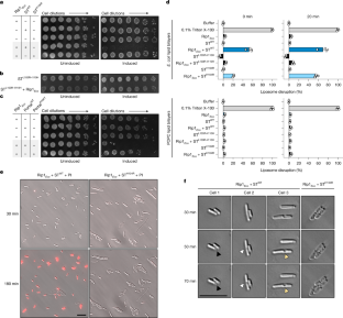 SEC profiles (left) of STL103R-I110H (a), STWT (b), and STH104R (c). The dashed line indicates the void volume. Selected fractions for each peak were analyzed by SDS-PAGE gels (right). Data are representative of three biological replicates. d, Coomassie-stained SDS-PAGE gels showing co-purification of untagged Rip1Eco with STWT-His6 (left), STL103R-I110H-His6 (middle) and STH104R-His6 (right). Data are representative of three biological replicates. The left panel is identical to that shown in Extended Data Fig. 3d. Source Data are provided.