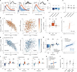 a, Dynamic regression model estimates of trial-by-trial reward rates (black) and TE coefficients for two example fibers across all trials and sessions through learning (see Methods). Dashed lines indicate the trials in which the TE coefficients and reward rates reached significance (p < 0.01, shuffle test). Fiber locations indicated in the coronal atlas schematic. Black line, reward rate, averaged with a moving average window of 50 trials. b, Histogram of lags between the earliest trial where TE and reward rate reached statistical significance for each fiber in the three included mice. Colours indicate different mice. Negative values indicate that TE becomes significant prior to reward rate. Mouse 1:t27 = −10.9, p = 7.0 × 10−11, n = 28 sites; Mouse 2: t27 = −76.2, p = 1.4 × 10−32, n = 28 sites, Mouse 3: t29 = −5.4, p = 2.6 × 10−5, n = 30 sites, t-test on difference in trials between significant trajectory error encoding and significant performance, p-values Bonferroni corrected for 3 mice. c, Non-negative matrix factors (NNMF) captured from trial-by-trial TE trajectories (estimated with dynamic regression) across sites within each mouse representing early (blue) and late (red) TE increases across training for each of the three mice recorded across learning (see Methods for details). d, TE coefficients across trials averaged across recording sites with a larger weight for the early (blue) or late (red) component and normalized to the maximum TE coefficient, for each mouse. Grey line, reward rate averaged with a moving average window of 50 trials. e, Horizontal (left) and sagittal (right) plane maps of the differences in the weights for the late and early components of the NNMF for each recording site (bubble) across mice (n = 88 fibers, 3 mice). f, Spatial coefficients representing the magnitude and direction of the variation in the difference between early and late NNMF weights in e. Data points represent individual mice. ML: t84 = 4.1, p = 3.11 × 10−4; AP: t84 = 3.6, p = 0.0016; DV: t84 = 1.4, p = 0.54, two-sided t-test on spatial coefficients, p-values bonferroni corrected for 3 dimensions. Error bar, 95% confidence interval around LME model coefficients. g, Vector showing the axis of maximal variation in weight difference, based on the coefficients in g. \(\underline{R}\), Rayleigh’s coefficient, S* = 9.92, p = 0.02. Thin lines represent individual mice. h, Horizontal plane maps of the differences in the weights for the late and early components of the NNMF for each mouse as in e. The bubble sizes indicate the DV position (increasing size indicates more dorsal positions). Shaded regions in all plots are 95% confidence intervals. Brain schematics were adapted from the Allen Mouse Brain Common Coordinate Framework (CCFv3) (https://atlas.brain-map.org/).