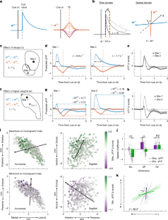 a, Angular velocity, signed by congruence, aligned to cue onset averaged across correct (blue) and incorrect (red) incongruent trials for one example mouse. b, ΔF/F aligned to cue onset averaged across correct (blue) and incorrect (red) trials for two example recording sites in the same mouse. Recording site locations indicated in c. c, Horizontal (top) and sagittal (bottom) maps of the difference in dip magnitude between correct and incorrect trials. Colour of each bubble (recording site) represents the difference, with positive values indicating a larger dip for correct trials. d, Spatial coefficients representing the magnitude and direction of the variation in the difference in cue-evoked dip magnitude between correct and incorrect incongruent trials at recording sites with a significant dip on either trial type (ML: t127 = 4.74, p = 1.66 × 10−5; AP: t127 = 4.01, p = 3.06 × 10−4; DV: t127 = 5.21, p = 2.25 × 10−6; n = 131 sites, 10 mice, two-sided t-test on effect of location on dip magnitude difference in a LME, Bonferroni corrected). e, Vector showing the axis of maximal variation in dip magnitude difference, based on the coefficients in d. \(\underline{R}\), Rayleigh’s coefficient, S* = 22.38, p = 5.43 × 10−5. Thin lines represent individual mice. Shaded regions and error bars in all plots are 95% confidence intervals around the mean (a,b) or LME coefficient estimates (d).