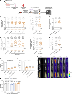 a, Neutralizing activity of GTX29202, 4E11, 4G2, and 21F2 antibodies against the DENV2 NGC strain. b, Neutralizing activity of the Z20 antibody against the ZIKV PRVABC59 strain. c, Neutralizing activity of anti-JEV serum against the JEV SA14 strain. a-c, Viruses were preincubated with the corresponding antibody at 37 °C for 30 min and then transferred to Vero cell monolayers. FFU, focus-forming units. d-f, The stabilities of anti-DENV (d) and anti-ZIKV (e) antibodies and anti-JEV serum (f) were assessed by ELISA. Each anti-flavivirus E neutralizing antibody (0.2 μg/μl) was microinjected into the thorax of Ae. aegypti mosquitoes. Anti-JEV serum (1:10 dilution) was injected thoracically into Cx. quinquefasciatus. Mosquitoes were homogenized in sterile PBS at the indicated time points of postinoculation. The supernatant was filtered (0.22 μm) and examined by ELISA. For all ELISAs, the results of dilution at 1:2000 are presented. a-f, Representatives results from 2 independent experiments and the data are presented as the mean ± s.e.m. g-i, Determination of the neutralizing activity of antibodies against flaviviruses in vivo. Ten MID50 DENV2 or ZIKV was premixed with 0.2 μg/μl of anti-E neutralizing antibodies for 30 mins. The mixture was intrathoracically microinjected into the Ae. aegypti mosquitoes. The Cx. quinquefasciatus mosquitoes were intrathoracically inoculated with the mixture of 10 MID50 JEV and anti-JEV serum (1:10 dilution) with the same experimental settings. j-l, Intrathoracic inoculation of neutralizing antibodies into the infected mosquitoes (3 days after oral infection) did not interrupt the flavivirus propagation in the mosquitoes. A mixture containing fresh human blood (50% v/v) and supernatant from (j) DENV2- or (k) ZIKV-infected Vero cells (50% v/v) was used to feed Ae. aegypti via an in vitro blood feeding system. For Cx. quinquefasciatus, the supernatant from (l) JEV-infected Vero cells were used for oral infection. At 3 days post infection, 0.2 μg/μl anti-flavivirus E neutralizing antibody or anti-JEV serum (1:10 dilution) was microinjected into the thorax of fed mosquitoes, with mouse isotype control IgG or pre-immune serum serving as controls. A total of 3 × 106 FFU/ml of either DENV2 or ZIKV, or JEV was used for oral infection. g-l, Mosquito infectivity was determined by RT-qPCR at 4 days after virus inoculation (g-i) or 8 days after oral infection (j-l). Each dot represents data from an individual mosquito. The P values were analysed statistically with a two-tailed Mann–Whitney test. The data were pooled from 2 independent biological replicates. The horizontal line represents the median and the limit of detection is illustrated by black dotted lines. Bonferroni correction was used to account for multiple comparisons (g,j). (a,b,d,e,g,h,j,k) Mouse isotype IgG served as a negative control. (c,f,i,l) Pre-immune serum served as a negative control.