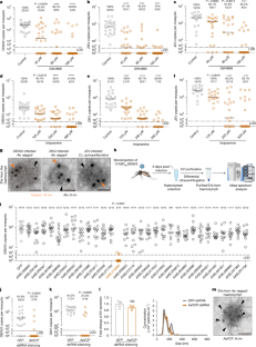 a,b, The concentration and size distribution of EVs isolated from the haemolymph of Ae. aegypti treated with GW4869 (a) or Imipramine (b) were measured by nanoparticle tracking analysis (NTA). The graph (left) shows the fold change in the number of EVs isolated from mosquito haemolymph. The results are representative of 3 independent experiments. Serial concentrations of GW4869 or Imipramine were microinjected thoracically into Ae. aegypti. EVs from mosquito haemolymph were purified at 3 days postinjection by differential ultracentrifugation and analysed by NTA. The results are representative of 3 independent biological replicates. c-h, Assessment of Ae. aegypti fitness after GW4869 and Imipramine treatment. Mosquitoes were intrathoracically inoculated with a series of concentrations of GW4869 or Imipramine. c,d, Survival rates of mosquitoes inoculated with GW4869 (c) or Imipramine (d). Mosquitoes were offered a bloodmeal at 3 days after inoculation, and then the number of laid eggs (e,f) and the hatching rate (g,h) of mosquitoes were measured. The data were pooled from 2 independent biological replicates. i, Generation of a mouse anti-AaAlix polyclonal antibody by immunizing mice with purified recombinant AaAlix protein expressed in E. coli. The antibody was validated by probing mosquito EVs purified from the Aag2 or Cxq-1 cell culture supernatant. Samples probed with mouse pre-immune serum served as a negative control. The representative images from 3 independent biological replicates are shown. j, Detection of the E and prM protein in EVs isolated from DENV2-infected mosquitoes haemolymph by immunogold stanning. EVs were stained with AaAlix (6 nm) and anti-E (18 nm) or anti-prM (18 nm) antibody. The black arrowheads indicate mosquito Alix. Scale bar, 50 nm. The results are representative images of 2 independent biological replicates. a-h, P values were analysed with a two-tailed t test (a,b,g,h), the two-tailed log-rank (Mantel–Cox) test (c,d), or a two-tailed Mann–Whitney test (e,f). n.s., not significant (c-h). a,b,e-h, Bonferroni correction was used to account for multiple comparisons. a,b, Each dot represents data from a pool of EVs collected from the haemolymph of 60 mosquitoes. These data are presented as the mean ± s.e.m. Each dot represents the number of laid eggs per mosquito (e-f). The dots represent the data from 2 independent biological replicates: 277 ~ 337 eggs per dot (g-h). These data are presented as the mean ± s.e.m.