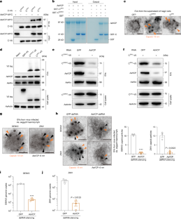 a,b, Knockdown of CqVCP expression in Cx. quinquefasciatus. Mosquitoes were microinjected with CqVCP dsRNA. GFP dsRNA served as a control. CqVCP abundance was assessed by RT-qPCR (a) and western blotting (b) at 3 days postinjection. CqVCP mRNA level was normalized to that of Cx. quinquefasciatus actin (CPIJ012570). The results are representative of 3 independent biological replicates. c, Silencing CqVCP inhibited JEV infection in Cx. quinquefasciatus. A mixture containing fresh human blood (50% v/v) and supernatant from JEV-infected Vero cells (50% v/v) was used for in vitro blood feeding. Mosquito infectivity was determined by RT-qPCR at 8 days after oral infection. The data were pooled from 2 independent biological replicates. d, The interaction between CqVCP and CJEV was detected by coimmunoprecipitation assay. Aag2 cells were cotransfected with expression plasmids encoding CJEV and CqVCP. The cell lysates were incubated with anti-V5 antibody-conjugated beads. The protein interactions were analysed by western blotting. e, The direct interaction between CqVCP and CJEV was detected by GST pull-down assay. Both CqVCP and CJEV were expressed and purified in E. coli. The GST or GST-CJEV fusion proteins were immobilized on glutathione beads, and 30 μg of purified CqVCP protein was incubated for a pull-down assay. The protein interactions were then detected by Coomassie blue in an SDS–PAGE gel. f,g, Detection of CJEV in EVs isolated from Cxq-1 cell supernatants by immunogold staining (f) and western blotting (g). Cxq-1 cells were transfected with a plasmid encoding CJEV. EVs were isolated from the supernatant by differential ultracentrifugation at 48 h posttransfection. Cxq-1 cells transfected with a GFP-expressing plasmid served as a negative control. h, Silencing CqVCP reduced the abundance of CJEV in mosquito EVs. Cxq-1 cells were transfected with CqVCP dsRNA. GFP dsRNA served as a control. At 48 h posttransfection, Cxq-1 cells were transfected with a plasmid encoding CJEV. EVs were isolated from the supernatant by differential ultracentrifugation at 48 h posttransfection and then assessed by western blotting. The results are representative images of 4 independent biological replicates. i, Co-localization of CqVCP (6 nm) with CJEV (18 nm) in EVs isolated from the haemolymph of JEV-infected Cx. quinquefasciatus, as detected by immunogold staining. j,k, Silencing CqVCP reduced the levels of JEV capsid proteins and genomes in EVs. Cx. quinquefasciatus were inoculated with 10 MID50 JEV via thoracic microinjection, and EVs were isolated from the haemolymph of infected mosquitoes by differential ultracentrifugation at 6 days postinfection. (j) Representative TEM images of immunogold staining (left panel) and quantitative analysis of TEM images (right panel) showed the presence of viral capsids in mosquito EVs. (k) The JEV genomes in mosquito EVs were detected by RT-qPCR. The data are presented as the mean ± s.e.m. from 4 independent biological replicates. Each dot represents data from a pool of EVs collected from the haemolymph of 20 JEV-infected mosquitoes. The P values were analysed with a two-tailed t test. a,c, Each dot represents data from an individual mosquito. The horizontal line represents the median. Statistical significance was evaluated with a two-tailed Mann–Whitney test. c, The number at the top of each column represents the number of infected mosquitoes/total number of mosquitoes. The limit of detection is illustrated by black dotted lines. d-g,i,j, The results are representative images of 3 independent biological replicates. f,i,j, Orange arrowheads indicate the JEV capsid, whereas black arrowheads indicate CqVCP. Scale bar, 50 nm. For quantitative analysis (j), randomly selected infectious EVs fields (n = 3) were analysed for statistical evaluation. The data are presented as the mean ± s.d. and were pooled from 3 independent biological replicates. Statistical significance was evaluated with the two-tailed t test.