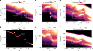 a-f, PL of quantum confined trions from potential trap-4 to 9 versus v and photon energy. Dashed boxes highlight the FCI states with anyon-trions.