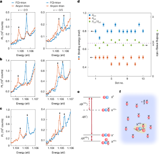 a-f, Left panels: PL spectra of the −2/3 anyon-trion (red, v = −0.68) and FCI-trion (blue, v = −2/3). Right panels: PL spectra of the −2/3 anyon-trion (red, v = −0.61) and FCI-trion (blue, v = −3/5). The data are from six different potential traps (traps−2, 6 to 8, 10 and 11).