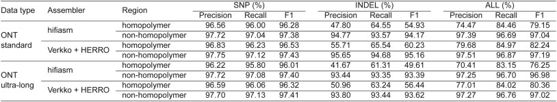 Extended Data Table 2 HG002 fully phased assembly variant calling compared with the HG002 benchmark (SUP basecalling model)