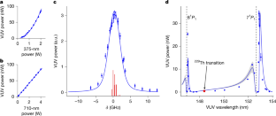 With the 710-nm beam shuttered, the PMT records a background count rate of 1.42(1) × 105 s−1. At t ≈ 3.5 s, the 710-nm beam is unshuttered and the count rate rises to 4.76(34) × 106 s−1. Control measurements verify that the background count is dominated by residual 375-nm stray light, that the PMT is insensitive at 710-nm and that it operates in the linear regime. Using the overall detection efficiency ηabs = 0.21(4) × 10−4 (Extended Data Table 1), we infer a VUV power of 290(60) nW at 148.4 nm.