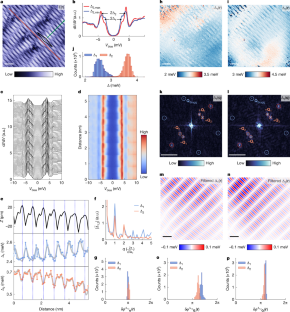 a, Atomic resolution STM image (14 × 14 nm2) acquired simultaneously with the spectroscopic imaging-STM measurements in Fig. 2h,i. b, FT of (a). c-e, FT-filtered images of the moiré superlattice at ±Q1 (d) and ±Q2 (e), and their sum (c). f, g, FT-filtered images of Δ1 at ±Q1 (f) and ±Q2 (g). h, i, FT-filtered images of Δ2 at ±Q1 (h) and ±Q2 (i). The gap modulations in (f-i) exhibit phase shifts relative to the moiré superlattice in (d, e), which can also be extracted using the 2D lock-in method (Figs. 2o, p, and S3). Scale bars: 2 nm (a, c-i); 1 Å−1 (b).