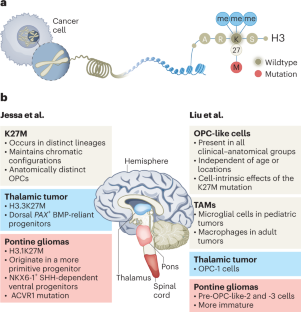 K27M mutation of histone H3 has been identified as a driver event in diffuse midline glioma. Two studies used comprehensive multi-model single-cell genomic, epigenomic and chromatin structure analysis to characterize the cell of origin and find a distinct etiology of H3K27M between pontine and thalamic tumors, and show that pontine gliomas harbor more immature oligodendrocyte-precursor-like cells.