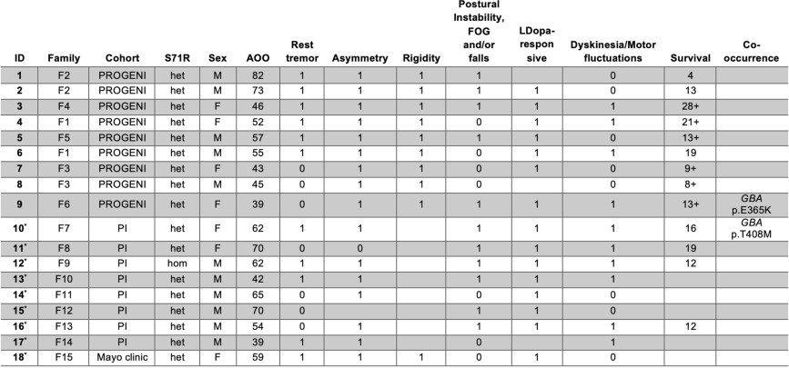 1. Individuals for which detailed case reports are available are indicated by an asterisk (Supplementary Note). ‘1’ indicates that the symptom is present, ‘0’ indicates the symptom was not present, blank indicates unknown. A ‘+’ in the Survival field indicates that the individual was alive at last follow-up. Abbreviations: PI, Parkinson Institute; AOO, age of onset; FOG, freezing of gait.