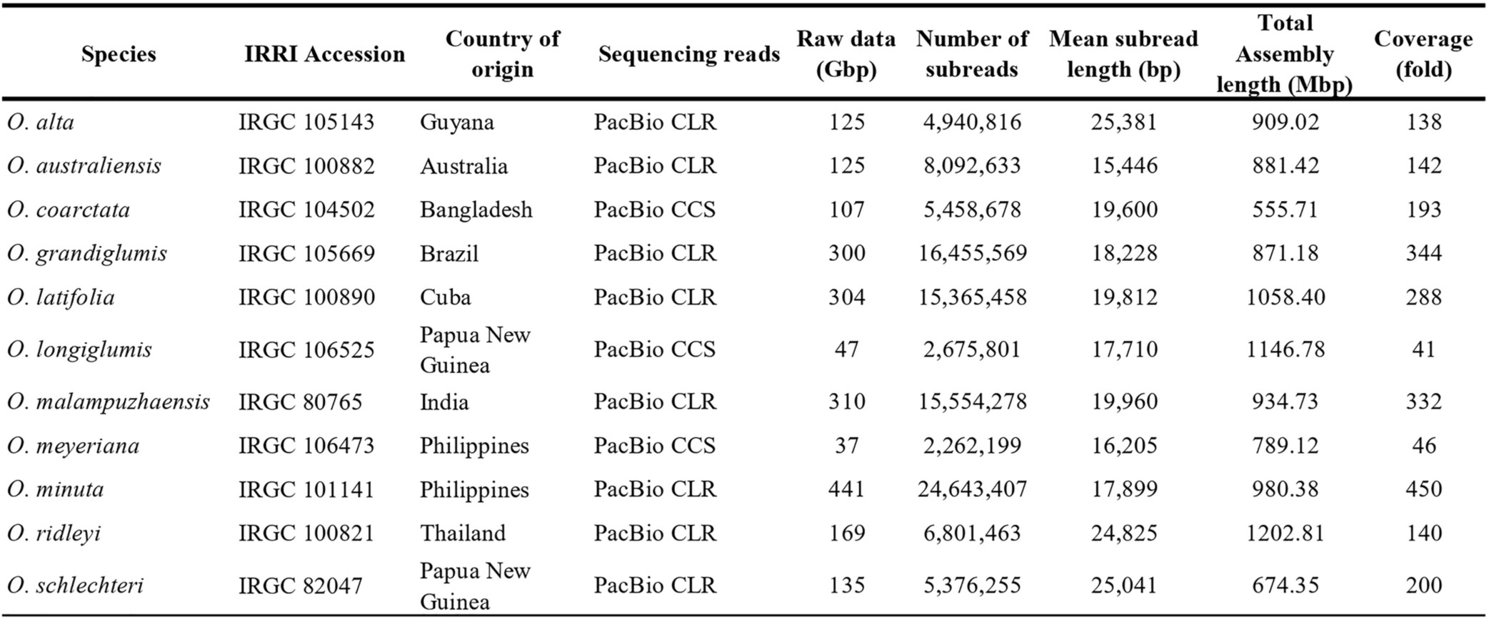1. IRGC accession, country of origin, and sequencing data type and statistics of the 11 wild Oryza genomes presented in this study. Passport data of the Oryza species are available in the IRRI GrinGlobal genebank at: https://gringlobal.irri.org/gringlobal/search