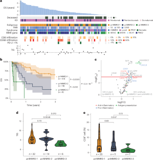 a, Overall survival of priMMRD-HGG by subgroup, which did not receive immune checkpoint inhibitor therapy. b, Forest plot of the Cox-proportional hazards model of priMMRD-1 glioma treated with either anti-PD1 monotherapy or chemoirradiation. c, Forest plot of Cox-proportional hazards model of priMMRD-2 glioma treated with either anti-PD1 monotherapy or chemoirradiation. d, Forest plot of the Cox-proportional hazards model of priMMRD-3 glioma treated with either anti-PD1 monotherapy or chemoirradiation. e, Forest plot of Cox-proportional hazards model of priMMRD-HGG treated with anti-PD1 monotherapy, adjusted for subgroup, MMRD syndrome, age and sex. Error bars indicate a 95% confidence interval for b through e.