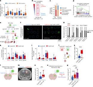 a, Correlation of TP53 inactivation with BM prevalence across carcinomas, for female (left) and male (right) tumors. Each dot represents a primary carcinoma (for lung and kidney, the highest-ranking subtypes were considered). Female: one-sided Spearman’s ρ = 0.58, p = 0.04. Male: one-sided Spearman’s ρ = 0.80, p = 0.003. b, Pan-cancer analysis of TP53 perturbation prevalence: TP53 alterations, and biallelic TP53 inactivation in particular, are enriched in BM in comparison to primary tumors and to other metastatic sites (MSK-IMPACT cohort17). Two-sided Fisher’s exact test, TP53 inactivation vs. TP53-WT: BM vs. primary tumor, ****p = 1 × 10−5, BM vs. other metastasis, ****p = 1 × 10−5. TP53 biallelic inactivation vs. TP53-WT: BM vs. primary tumor, ****p = 1 × 10−5, BM vs. other metastasis ****p = 1 × 10−5. Primary n = 2947, brain n = 126, chest wall n = 79, liver n = 658, lymph node n = 571, pleura n = 111, soft tissue n = 80, lung n = 265, bone n = 252, peritoneum n = 48, ovary, skin n = 47, pleural fluid n = 33, adrenal gland n = 34. c–e, Association between TP53 perturbation BM potential in carcinoma cell lines. c, In total, 367 carcinoma cell lines were grouped by their BM potential (top vs. low 25%). Panel c was created with BioRender.com. d, High-BM carcinoma cell lines show enrichment of TP53 biallelic inactivation (two-sided Fisher’s exact test *p = 0.03). e, High-BM carcinoma cell lines show decreased p53 signaling, as evaluated by GSEA. Oncogenic signatures: ‘P53_DN.V1_DN’ p = 0.015, rank #3. ‘P53_DN.V1_UP p = 0.027’, rank #4. See Supplementary Table 3. f–i, TP53 alterations are enriched in BM vs. other metastases from primary lung tumors. f, Non-small cell lung cancer metastasis. Two-sided Fisher’s exact test, TP53 inactivation vs. TP53-WT: BM vs. primary tumors ****p = 1 × 10−5, BM vs. other metastasis ***p = 8 × 10−4. TP53 biallelic inactivation vs. TP53-WT: BM vs. primary tumors ****p = 1 × 10−5, BM vs. other metastasis ****p = 1 × 10−5. Primary n = 915, brain n = 59, chest wall n = 11, liver n = 68, lung n = 10, soft tissue n = 12, lymph node n = 211, bone n = 48, adrenal gland n = 19, pleura n = 73, pleural fluid n = 25. g, Lung adenocarcinoma metastasis. Two-sided Fisher’s exact test, TP53 inactivation vs. TP53-WT: BM vs. primary tumors ****p = 1 × 10−5, BM vs. other metastasis **p = 0.0017. TP53 biallelic inactivation vs. TP53-WT: BM vs. primary tumors ****p = 1 × 10−5, BM vs. other metastasis ***p = 1 × 10−4. Primary n = 781, brain n = 53, chest wall n = 10, liver n = 65, lung n = 10, lymph node n = 152, bone n = 40, soft tissue n = 10, pleural fluid n = 24, pleura n = 68, adrenal gland n = 16, other n = 425. h, Lung squamous cell carcinoma metastasis. Two-sided Fisher’s exact test, TP53 inactivation vs. TP53-WT: BM vs. primary tumors p = 0.13, BM vs. other metastasis p = 0.55. TP53 biallelic inactivation vs. TP53-WT: BM vs. primary tumor p = 0.57, BM vs. other metastasis **p = 0.01. Primary n = 122, brain n = 3, pleura n = 4, bone n = 7, lymph node n = 14. i, Poorly differentiated, non-small cell lung cancer. Two-sided Fisher’s exact test, TP53 inactivation vs. TP53-WT: BM vs. primary tumors p = 1, BM vs. other metastasis p = 1. TP53 biallelic inactivation vs. TP53-WT: BM vs. primary tumors p = 0.4, BM vs. other metastasis *p = 0.045. Primary n = 12, brain n = 3, bone n = 1, lymph node n = 5, pleura n = 1, adrenal gland n = 1, liver n = 1. j,k, GSEA of primary lung adenocarcinomas. j, Comparison of tumors based on their TP53 status. Panel j was created with BioRender.com. k, TP53-deficient primary lung adenocarcinomas show increased expression of BM signatures (TCGA PanCancer Atlas). TP53 inactivation vs. TP53-WT, ‘Smid_breast_cancer_relapse_in_brain_up’ p = 0.002, ‘Smid_breast_cancer_relapse_in_brain_dn’ p = 0. TP53 inactivation: n = 366, TP53-WT: n = 185 tumor samples. l, ssGSEA comparison shows that TP53 inactivation is associated with increased BM expression signatures. Two-sided t-test, ‘Smid_breast_cancer_relapse_in_brain’ ****p = 2.1 × 10−23, ‘Smid_breast_cancer_relapse_in_brain_up’ ****p = 1.5 × 10−11, ‘Smid_breast_cancer_relapse_in_brain_dn’ ****p = 2.7 × 10−18. m, ssGSEA comparison shows that TP53 inactivation is associated with decreased bone-metastasis expression signatures. Two-sided t-test, ‘Smid_breast_cancer_relapse_in_bone’ ****p = 1.2 × 10−9, ‘Smid_breast_cancer_relapse_in_bone_up’ ****p = 4.8 × 10−8, ‘Smid_breast_cancer_relapse_in_bone_dn’ ****p = 5.9 × 10−5.. n, TP53-deficient primary lung adenocarcinomas with biallelic inactivation show increased expression of BM signatures (TCGA PanCancer Atlas). ‘Smid_breast_cancer_relapse_in_brain_up’ p = 0.01, ‘Smid_breast_cancer_relapse_in_brain_dn’ p = 1 × 10−4. TP53-null n = 169, TP53-WT n = 185. o, ssGSEA comparison shows that TP53 biallelic inactivation is associated with increased BM expression signatures. Two-sided t-test, ‘Smid_breast_cancer_relapse_in_brain’ ****p = 2.3 × 10−27, ‘Smid_breast_cancer_relapse_in_brain_up’ ****p = 8.2 × 10−15, ‘Smid_breast_cancer_relapse_in_brain_dn’ ****p = 1.1 × 10−19. p, ssGSEA comparison shows that TP53 biallelic inactivation is associated with decreased bone-metastasis expression signatures. Two-sided t-test, ‘Smid_breast_cancer_relapse_in_bone’ ****p = 1.69 × 10−10, ‘Smid_breast_cancer_relapse_in_bone_up’ ****p = 1.75 × 10−8, ‘Smid_breast_cancer_relapse_in_bone_dn’ ****p = 1.7 × 10−5. See Source Data.