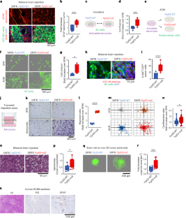 Extended Data Fig. 5 Mouse astrocytes infiltrate p53-null BMs and promote the survival, proliferation and migration of p53-null mouse BC cells in the brain.