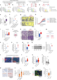 a, Overlap of CAL51 p53 CUT&Tag peaks with ChIP Atlas p53-bound genes72. A total of 3,524 peaks (54%) overlap; two-sided chi-squared test, p = 1 × 10−5. See Supplementary Table 16. b, CUT&Tag read coverage plot showing p53 binding at CDKN1A promoter in TP53-WT CAL51 cells. c, Overlap of CAL51 p53 CUT&Tag peaks with ChIP Atlas SREBP1-bound genes72. A total of 823 peaks (14%) overlap; two-sided chi-squared test, p = 1 × 10−5. See Supplementary Table 16. d, SREBF1 mRNA by qPCR: Higher SREBF1 mRNA levels in TP53-null vs. TP53-WT CAL51 cells (SFM, two-sided t-test, ***p = 2 × 10−4. n = 5). e, TP53 mRNA by qPCR: siRNA-mediated TP53 knockdown resulted in >90% reduction in TP53 mRNA levels in MCF10A and MCF7 cells (paired one-sided t-test, MCF10A ***p = 9.9 × 10−4, MCF7 ***p = 1.2 × 10−4, n = 3). Error bars, mean ± s.d. f, CDKN1A mRNA by qPCR: elevated CDKN1A mRNA levels following exposure to nutlin-3 in MCF10A and MCF7 cells (paired one-sided t-test, MCF10A *p = 0.02, MCF7 *p = 0.03, n = 3). Error bars, mean ± s.d. g, Cdkn1a mRNA qPCR: elevated Cdkn1a mRNA levels following Trp53 overexpression in 4T1 mouse BC cells (paired one-sided t-test, ***p = 6 × 10−4, n = 5). h, DEPDC1 mRNA (TCGA BC cohort): highest DEPDC1 expression in primary BCs with biallelic TP53 inactivation, intermediate expression in tumors with monoallelic TP53 inactivation, and lowest expression in TP53-WT tumors. Two-sided t-test, monoallelic TP53 inactivation vs. TP53-WT ****p = 8.4 × 10−22; TP53-WT/del vs. TP53-WT ****p = 2.1 × 10−10; TP53-WT/mut vs. TP53-WT ****p = 1.5 × 10−21; biallelic TP53 inactivation vs. TP53-WT ****p = 8.8 × 10−57; monoallelic vs. biallelic TP53 inactivation ****p = 8.3 × 10−22. TP53-WT: n = 266, monoallelic: n = 337, TP53-WT/del: n = 287, TP53-WT/mut: n = 50, biallelic: n = 279. i, ssGSEA of p53 targets: lower p53 pathway activity in DEPDC1-high tumors (top 10%) vs. DEPDC1-low tumors (bottom 10%). Two-sided t-test, ‘KANNAN_p53_targets’, ****p = 9.4 × 10−30, ‘KANNAN_p53_targets_UP’ ****p = 1.9 × 10−23, ‘KANNAN_p53_targets_DN’ ****p = 9.5 × 10−13. DEPDC1-high: n = 90, DEPDC1-low n = 90. j, Transcriptional signatures associated with DEPDC1 by GSEA. DEPDC1-high tumors were enriched for adipogenesis: ‘Burton_Adipogenesis-3’ (red), rank #13/5844; ****p = 5.8 × 10−88). See Supplementary Table 17. k, DEPDC1 mRNA by qPCR: siRNA-mediated DEPDC1 knockdown reduced its mRNA by >90% in MDA-MB-231 cells (paired one-sided t-test, siDEPDC1(I) ****p = 2.5 × 10−7, siDEPDC1(II) ****p = 8.2 × 10−7, n = 4). l,m, DEPDC1 protein by western blot: siRNA-mediated DEPDC1 knockdown resulted in a reduction in SCD1 protein levels in four human BC cell lines. l, Representative gel. m, Quantification. Paired one-sided t-test, siDEPDC1(I), siDEPDC1(II) vs. control: MCF7 **p = 0.0023, **p = 0.001; MDA-MB-231 *p = 0.02, **p = 0.004; MDA-MB-468 **p = 0.009, *p = 0.01; SK-BR-3 **p = 0.008, **p = 0.003. n = 3. Error bars, mean ± s.d. n, DEPDC1 Chromatin IP (ChIP) in MCF10A cells: enrichment for DEPDC1 binding at the proximal promoter of SCD1. ChIP-fold enrichment over IgG, region C (paired one-sided t-test *p = 0.049 n = 3). Error bars, mean ± s.d. o,p, mRNA of SREBP1 targets. o, Higher expression of SREBP1 targets in DEPDC1-high (top 10%) vs. DEPDC1-low (bottom 10%) primary BCs (TCGA). ‘HORTON_SREBP_TARGETS’, one-sided t-test **p = 0.009. DEPDC1-high n = 90, -low n = 90. p, Highest expression of SREBP1 targets in primary BCs with biallelic TP53 inactivation, and intermediate expression in tumors with monoallelic TP53 alterations compared to TP53-WT BCs. ‘Horton_SREBP_targets’ one-sided t-test, TP53 biallelic vs. TP53-WT **p = 0.01; TP53 monoallelic vs. TP53-WT p = 0.09. TP53-WT: n = 266, monoallelic: TP53 n = 337, biallelic: TP53 n = 279. q,r, Metastatic capacity by ssGSEA. q, Reduced bone-metastasis signatures in DEPDC1-high tumors (top 10%, TCGA). Two-sided t-test, ‘Smid_breast_cancer_relapse_in_bone’ ****p = 3.1 × 10−36, ‘Smid_breast_cancer_relapse_in_bone_up’ ****p = 1.4 × 10−37, ‘Smid_breast_cancer_relapse_in_bone_dn’ ****p = 3.9 × 10−29. DEPDC1-high n = 90, DEPDC1-low n = 90. r, Increased brain metastasis signatures in DEPDC1-high tumors (top 25%). Two-sided t-test, ‘Smid_breast_cancer_relapse_in_brain’ ****p = 1.5 × 10−51, ‘Smid_breast_cancer_relapse_in_brain_up’, ****p = 3.6 × 10−50, ‘Smid_breast_cancer_relapse_in_brain_dn’ ****p = 3.4 × 10−48. DEPDC1-high n = 223, DEPDC1-low n = 223. s, Srebf1 mRNA by qPCR: Higher Srebf1 mRNA levels in ACM-exposed Trp53-null vs. Trp53-WT EMT6 cells. Paired one-sided t-test *p = 0.02. TP53-WT: n = 6, TP53-null: n = 6. t, DEPDC1 mRNA by qPCR: Higher DEPDC1 mRNA levels in ACM-exposed TP53-null vs. TP53-WT CAL51 cells. Paired one-sided t-test *p = 0.01. TP53-WT: n = 11, TP53-null: n = 11. u,v, DEPDC1 protein by western blot. u, Representative gel. v, Elevated DEPDC1 protein levels in TP53-null CAL51 cells cultured in SFM, with further increase following ACM exposure. Paired one-sided t-test, TP53-null ACM/SFM vs. TP53-WT ACM/SFM *p = 0.04. n = 4. Boxplots: bar = median; box = 25–75th percentile; whiskers = range.
