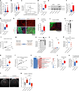 a, SCD1 expression is higher in BMs vs. their matched primary tumors (GSE125989). Paired two-sided t-test *p = 0.04. Matched primary tumors and BMs: n = 16. b,c, SCD1 and FASN mRNA expression levels are elevated in BMs vs. other metastases. b, GSE1418: one-sided t-test **p = 0.003, FASN *p = 0.03. BM: n = 7, metastases in other sites: n = 29. c, GSE245414: one-sided t-test, SCD1 **p = 0.01, FASN **p = 0.01. BM: n = 6, other metastatic sites: n = 26. d,e, SCD1 mRNA levels were higher in human BCs with monoallelic or biallelic TP53 inactivation, irrespective of their mode of p53 inactivation (mutation or copy-number loss). d, TCGA one-sided t-test: TP53-monoallelic inactivation vs. TP53-WT*p = 0.01, TP53-WT/del vs. TP53-WT *p = 0.02, TP53-WT/mut vs. TP53-WT *p = 0.046; biallelic TP53 inactivation vs. TP53-WT ****p = 1.4 × 10−5. TP53-WT: n = 266, TP53-WT/del: n = 287, TP53-WT/mut: n = 50, biallelic TP53 inactivation: n = 279. e, METABRIC, one-sided t-test: TP53-monoallelic inactivation vs. TP53-WT **p = 0.009; TP53-WT/del vs. TP53-WT *p = 0.02; TP53-WT/mut vs. TP53-WT *p = 0.01; biallelic TP53 inactivation vs. TP53-WT ***p = 6 × 10−4. TP53-WT: n = 592, biallelic TP53 inactivation: n = 324, TP53-WT/del: n = 280, TP53-WT/mut: n = 138. f, FASN mRNA levels were higher in primary BCs with biallelic TP53 inactivation vs. TP53-WT tumors (TCGA; LumB subtype). One-sided t-test *p = 0.02. TP53-WT: n = 31, biallelic TP53 inactivation: n = 63. g, FASN mRNA levels were higher in tumors with biallelic TP53 inactivation vs. TP53-WT tumors (METABRIC; LumB subtype). One-sided t-test, **p = 0.002. TP53-WT: n = 128, TP53-mut/del: n = 63. h, FASN mRNA levels were higher in human BCs with monoallelic or biallelic TP53 inactivation, irrespective of their mode of p53 inactivation (TCGA and METABRIC cohorts combined; LumA subtype). One-sided t-test: TP53-WT/del vs. TP53-WT **p = 0.004; TP53-WT/mut vs. TP53-WT *p = 0.03; biallelic TP53 inactivation vs. TP53-WT ****p = 3 × 10−5. TP53-WT: n = 159, TP53-WT/del: n = 157, TP53-WT/mut: n = 21, TP53-mut/del: n = 126. i, Correlation between FASN expression levels and p53 pathway activity. Low p53 pathway activity (ssGSEA score, ‘Kannan_p53_targets’) correlates with high FASN mRNA levels across primary BCs that metastasized to the brain (GSE125989). Two-sided Spearman’s ρ = –0.47, p = 0.035, n = 16. j, Scd1 mRNA levels by qPCR: Scd1 expression was higher in Trp53-null vs. -WT EMT6 cells grown in full medium, delipidated medium, or SFM (One-sided t-test *p = 0.01, **p = 0.003, **p = 0.003). Full: n = 4, delipidated: n = 3, SFM: n = 4. k, Fasn mRNA levels by qPCR. Fasn expression was higher in Trp53-null EMT6 grown in full medium, delipidated medium or ACM. One-sided t-test p = 0.11, ***p = 7 × 10−4, p = 0.05. Full: n = 3, delipidated: n = 3, ACM: n = 6 and n = 3 for Trp53-WT and Trp53-null, respectively. l,m, ACM increased SCD1 protein levels more in TP53-null and TP53-mut (R175H, R273H) vs. TP53-WT cells in an additional CAL51 isogenic cell system. l, Representative gel. m, Quantification. One-sided one-sample t-test, TP53-WT ACM vs. SFM *p = 0.02; TP53-null ACM vs. SFM **p = 0.002; TP53-mut (R175H) ACM vs. SFM **p = 0.01; TP53-mut (273H) ACM vs. SFM *p = 0.02. Paired one-sided t-test ACM/SFM: TP53-null vs. TP53-WT *p = 0.03; TP53-mut (R175H) vs. TP53-WT *p = 0.03, TP53-mut (R273H) vs. TP53-WT p = 0.07. TP53-WT: n = 9, TP53-null: n = 9. TP53-mut (R175H): n = 9, TP53-mut (R273H): n = 6. n,o, ACM increased FASN protein levels more in TP53-null and TP53-mut (R175H, R273H) vs. TP53-WT cells in an additional CAL51 isogenic cell system. n, Representative gel. o, Quantification. One-sided one-sample t-test, TP53-WT ACM vs. SFM p = 0.32; TP53-null ACM vs. SFM *p = 0.01; TP53-mut (R175H) ACM vs. SFM **p = 0.002; TP53-mut (273H) ACM vs. SFM *p = 0.04. Paired one-sided t-test ACM/SFM: TP53-null vs. TP53-WT **p = 0.008; TP53-mut (R175H) vs. TP53-WT *p = 0.01, TP53-mut (R273H) vs. TP53-WT p = 0.07. TP53-WT: n = 9, TP53-null: n = 9, TP53-mut: (R175H) n = 9, TP53-mut (R273H): n = 7. Boxplots: bar = median; box = 25–75th percentile; whiskers = range.