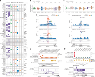 a–c, The circle represents expression quantitative trait loci (eQTLs) with a PP4 > 0.8. Triangles denote significant genes in the MR results, with the orientation of the triangle corresponding to the direction of the effect24,25,32. COLOC, colocalization; MR, Mendelian randomization; MiGA, Microglia Genomic Atlas; MG, microglia; Ext, excitatory neuron; IN, inhibitory neuron; Ast, astrocyte; OD, oligodendrocyte; OPC, oligodendrocyte progenitor cell; End, endothelial cell.