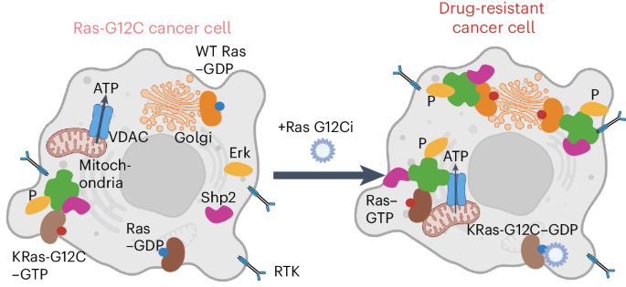 Mutations that overactivate the signaling enzyme Ras (rat sarcoma virus) are observed in one third of cancers1. Because of its strong oncogenic effect, there have been decades of effort to create therapeutics that target and inhibit mutant Ras. Covalent inhibitors against inactive Ras-G12C (bound to guanosine diphosphate (GDP))2,3 have recently demonstrated promising efficacy; however, most patients acquire drug resistance4 (Fig. 1a). Many reports have shown that resistance occurs through reactivation of the Ras–MAPK (mitogen-activated protein kinase) pathway5,6,7,8. However, it is unclear at the signaling level which cellular processes are affected by Ras inhibitors and what differentiates the drug-resistant cancer cell population from quiescent cells. KRas-G12C-expressing cancer cells also express wild-type (WT) HRas and NRas (H/NRas), thus WT Ras may have a compensatory role during mutant KRas inhibition7. While biochemically very similar, Ras isoforms are not functionally redundant, with one major difference being their subcellular localization. While all Ras isoforms can localize to the plasma membrane (PM), KRas4A also localizes to the mitochondrial outer membrane and H/NRas can dynamically shuttle to the endoplasmic reticulum (ER) and Golgi9,10. Thus, it is possible that KRas-G12C-driven cancer cells treated with Ras-G12C inhibitors adapt by reorganizing Ras signaling to enable drug resistance.