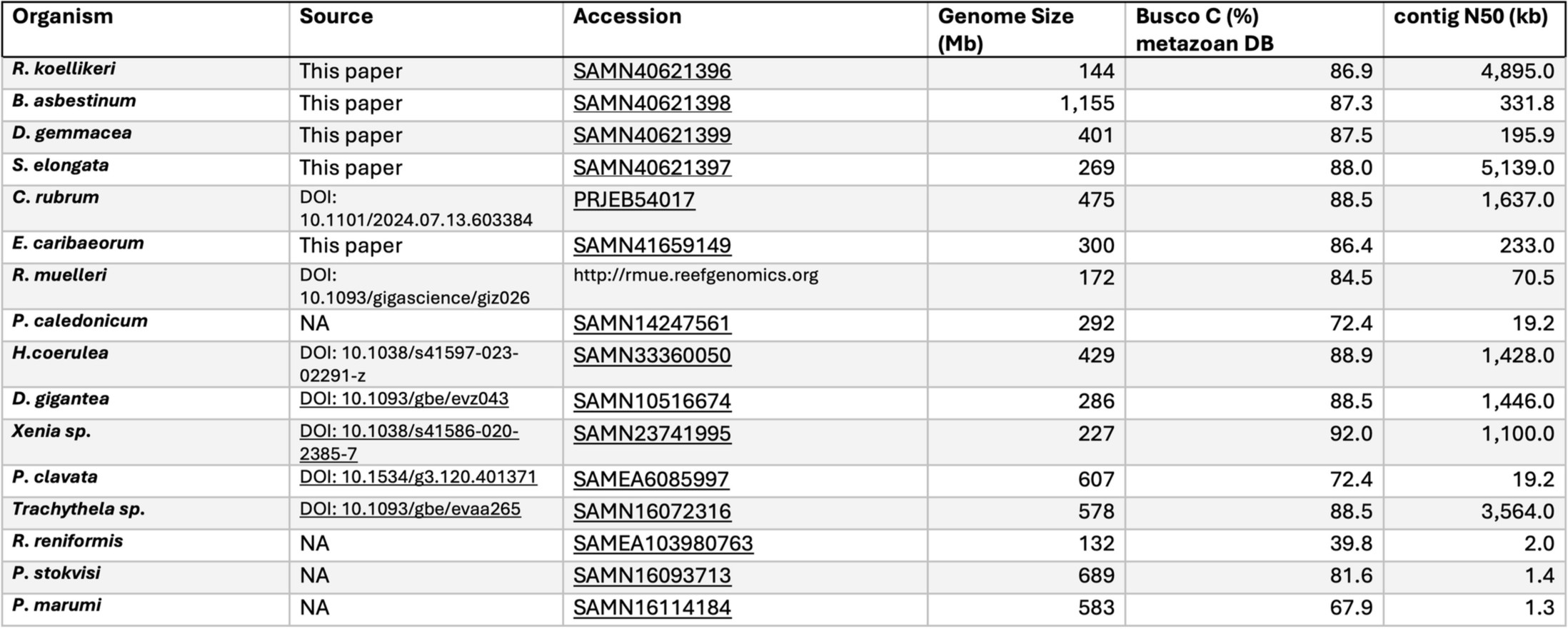 1. Octocoral genomes generated in this study (5) and public assemblies (11). DOI’s of papers associated with public genomes are provided where relevant. Accession numbers are provided for all.