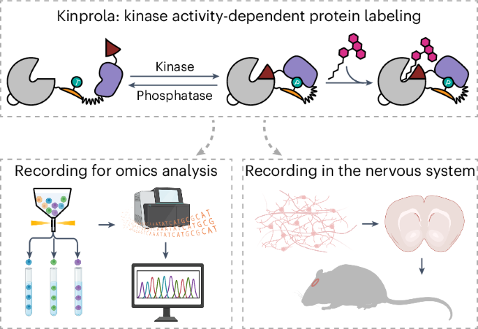 To address these challenges and complement the aforementioned approaches, we developed split-HaloTag recorders for kinase activity-dependent protein labeling (Kinprola). Kinprola enables the accumulation of an irreversible label in the presence of both a specific kinase activity and a fluorescent HaloTag substrate. Kinprola allows scalable recording of kinase activities for later analysis in different cellular compartments, and its modular design enables the generation of Kinprola variants for different kinases. We demonstrate the versatility of Kinprola for applications in transcriptome analysis, in functional genomic screening and for the tracking of neuromodulation in freely moving mice.