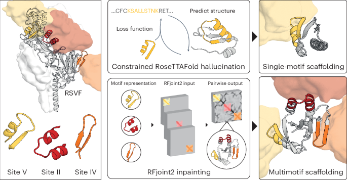To design scaffolds embedded with three distinct RSVF epitopes known to elicit neutralizing antibodies (Fig. 2a), we used the deep-learning-based RFjoint2 Inpainting method, derived from the RF structure prediction network. We provided fragment templates for sites II, IV and V from RSVF21,22,23, without specifying their relative orientations in the network (Fig. 2b). As these motifs are distinct and, to a large extent, self-contained, their relative orientations are not important for eliciting antibody responses. This flexibility in terms of the rigid-body orientation of the motifs enables the generation of a much greater diversity of scaffolds (Supplementary Fig. 5). Just as for the individual epitope scaffolding with RF, after the initial RFjoint2 Inpainting design step, we used ProteinMPNN19 to design the sequence of the scaffold and filtered using AF2 as described previously10 (Fig. 3a). To eliminate designs in which the antibodies could not be simultaneously bound to the same scaffold because of steric clashes, we aligned antibodies to the epitopes on the designed scaffold and filtered out those that were structurally incompatible with the antibody-binding modes (Fig. 3b). Because the rigid-body position of the epitopes was not prespecified, RFjoint2 was able to sample a broad range of different epitope positions (Supplementary Fig. 5).
