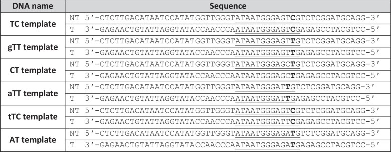 Extended Data Table 1 Sequences of template and non-template DNA strands used to construct artificial DNA promoters with pre-formed transcription bubbles