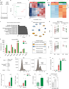 a, Data quality for the ATAC-seq was evaluated by calculating the Fraction of read in peaks (FRIP Score). b, Chromatin accessibility regions pie chart. c, Volcano plot for all significantly differentially accessible regions (DARs). d, Metrics for RNA-seq showing the sequencing library size of assigned reads. e, PCA plot in two dimensions of differential expressed genes in acute (salmon) and chronic (green) GC B cells. f, Histogram of the nominal p-values calculated by DESeq for synthetic data RNA-seq. g, Volcano plot for differentially expressed genes (DEGs) identified by RNA-seq. h, Within Sum of Square (WSS) plot for the optimal number of clusters determined by the K-mean analysis. i, Dot plot showing differential chromatin accessibility regions (DARs) or expressed genes (DEGs) (yellow dots) and the overlap between the two datasets (black dots). j, Heat maps for overlapped DARs (ATAC-Seq, left panel) and DEGs (RNA-Seq, right panel). k, PRC2 targets assessed within DARs (upper panels) or DEGs (lower panels); ****P < 0.0001,Wilcoxon matched-pairs signed rank test, two-tailed p-value. l, Plots of normalised counts for non-canonical PRC1 (top), PRC2 and PRC2 co-factors (bottom); n = 2 mice per group, data represent mean ± SEM.