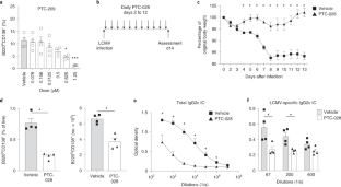 a, b, Representative flow cytometric plots of CTV-labelled wild-type B cells cultured with LPS and IL-4, and in the presence of PTC-209 at the indicated concentrations. Cells were assessed by flow cytometry for (a) ASC markers and (b) cell division, as determined by the dilution of CTV. c, Representative images of histological analysis of spleens 12d post-infection from Cd23Cre/+ and Bmi1f/fCd23Cre/+ mice treated with either the vehicle control or PTC-028; B220 (cyan), CD3 (magenta). Two examples of B cell follicles per individual mouse; two individual mice within each experimental group shown. Scale bar = 100μm.
