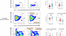For the naive B cell differentiation assay, 5 × 104 sorted resting naive B cells (CD19+CD27−IgD+CD24intCD38intIgM+) (purity >98%) were seeded in a 96-well culture plate in lymphocyte medium (RPMI 1640 complete medium (100 μl per well) supplemented with 10% heat-inactivated fetal bovine serum and activated with CpG ODN 2006 (400 μg ml−1; InvivoGen), recombinant human CD40L (1 μg ml−1; R&D Systems) and recombinant human IL-21 (50 ng ml−1; BioLegend). After 7 d cells were stained and analyzed for memory B cells (live CD19+CD27+CD38lo-int) and plasma cells (live CD19+CD27+CD38hi) by flow cytometry.
