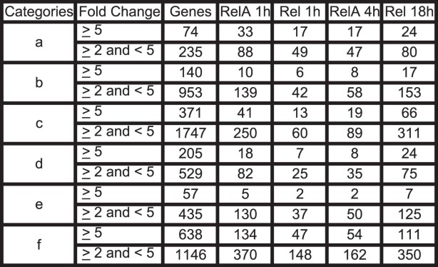 Extended Data Table 1 Inducible number of genes and RelA or Rel binding across differentially expressed genes in each k-means category. Each category was further segregated into two groups with >5 or >2 and <5-fold change. Numbers correspond to RelA or Rel ChIP–seq peaks at the indicated times that were annotated to genes in each group by HOMER