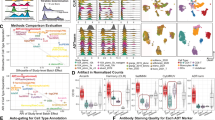Existing single-cell bone marrow cell atlases are challenged by a lack of enriched progenitor populations, donor ethnic diversity and precision antibodies for characterization. To construct a precision panel of titrated ADTs for HSPCs, we obtained fresh bone marrow aspirates from four donors of African and European ancestry (Supplementary Table 1). We conducted CITE-seq analysis on the following populations: (1) live bone marrow nucleated cells (BMNCs), (2) CD34+ cells (double column; CD34hi) enriched by immune-magnetic sorting (magnetic-activated cell sorting) and (3) flow-through (including CD34med/low cells) labeled with anti-CD271 and a single-column selection enriched for both CD271+ stroma and remaining CD34med/low-expressing cells (CD34+CD271+; Fig. 1a). As a reference set of ADTs, we used a prototype 277-plex TotalSeq-A antibody cocktail (titrated on PBMCs by the vendor). Given that many antibodies did not perform as anticipated, we worked with BioLegend to generate a customized 275-plex TotalSeq-A cocktail (comprised of 266 targeting antibodies and 9 clone-matching isotypes). The working concentrations for these antibodies were determined by the ADT signal from antibodies in the prototype PBMC-titrated mix, augmented by cytometry-based titration on CD34+ cells and BMNCs. The new titration panel was generated at eightfold working concentration (Supplementary Table 2) and was serially diluted to construct five concentrations (0.25×, 0.5×, 1×, 2× and 4×). We also included the prototype PBMC-titrated mix (at 1×). We used simultaneous labeling with TotalSeq-A Hashtag antibodies to denote concentration, donor and population (Fig. 1a and Extended Data Fig. 1), yielding over 315,000 single-cell profiles in which each cell could be confidently assigned to a specific concentration/donor (Supplementary Table 3 and Methods). To initially assign cellular identities in this large dataset by transcriptome, we performed label transfer (cellHarmony19) from four separate recently proposed bone marrow cell atlases (Extended Data Fig. 2a–d)3,20,21,22,23. Among the four references, we found notable discordance among cell annotations and cluster definitions. For example, stromal cells, plasma cells, eosinophil/mast cells, erythroblasts, dendritic cells (DCs) and distinct T cell/natural killer (NK) cell subsets were inconsistently annotated in these reference datasets, with some annotations supported only by a single atlas. Conversely, high-resolution unsupervised clustering (Iterative Clustering and Guide-Gene Selection version 2 (ICGS2)) predicted diverse novel cell states (Extended Data Fig. 2e). To overcome these inherent and systemic biases, we applied our recently developed integrative game theory-driven workflow called scTriangulate24 to assess the relative importance (stability metrics) and contribution of previously defined cell populations in bone marrow atlases in combination with our unsupervised clustering results (Fig. 1b). From this collection of 215 overlapping cluster definitions, we resolved 85 final clusters from scTriangulate with complementary evidence of transcriptional and reclassification stability (Fig. 1c–e). These resulting clusters were composed of a balanced mix of cell populations from the five different supervised and unsupervised sources. As expected, the CD34hi populations were enriched for primitive HSPCs, the CD34+CD271+ populations contained mature hematopoietic progenitors and stromal cells, and the BMNC populations contained mature immune cells (Fig. 1c). Some annotations of HSPCs were based on existing literature, whereas others represented new subclusters from ICGS25, such as common lymphoid progenitors (CLPs) and erythroid progenitors (ERPs; Fig. 1d). These clusters exhibited different levels of Shapley-associated confidence, an indication of cluster stability, with high confidence observed among lymphoid lineages, whereas early ERPs and most stem and multilineage progenitors were stable but were called with lower confidence (Fig. 1e). In sum, we labeled most populations according to annotations from the four source cell atlases while resolving new populations based on marker genes and relative position within the low-dimensional embeddings (Fig. 1f). Through this analysis, we confirmed well-characterized markers for each cluster (Fig. 1g–i and Supplementary Table 4), such as high expression of AVP in hematopoietic stem cell (HSC) populations (Fig. 1g) and PF4 in megakaryocyte progenitors (Fig. 1h). Notably, CD271 enrichment facilitated clear identification of six distinct clusters from 5,301 cells, including osteoblasts and osteoclasts and endothelial and stromal vascular cells (Fig. 1i).