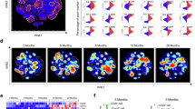 To obtain a global view of the dynamics of PBMC composition, the proportion of each of the 25 cell subsets in total PBMCs was calculated for each sample from the 13 age groups (Extended Data Fig. 3a). Of the 25 cell subsets, 22 exhibited significant differences in proportions among different age groups (Fig. 1d and Extended Data Fig. 3a) (Kruskal–Wallis test, false discovery rate (FDR) < 0.05). A proportion of certain cell subsets were positively correlated with age, such as CD4_TEM_GNLY cells and CD8_TEM_GNLY cells (Extended Data Fig. 3b) and others were negatively correlated with age, such as CD4_Naive_CCR7 cells, CD8_Naive_LEF1 cells, NK_CD56high cells and B_Naive cells (Extended Data Fig. 3c). Several cell subsets exhibited enrichment in certain age groups. For example, CD14+ monocyte cells were enriched in the umbilical cord blood group, plasma cells were enriched in children (peaking in the 6-year-old group) and CD8_MAIT_SLC4A10 cells were enriched in adolescents (peaking in the 18-year-old group) (Extended Data Fig. 3d). Three cell subsets did not show significant changes in proportion with respect to age (for example, natural killer (NK) proliferating, CD16+ monocytes and plasmacytoid dendritic cells), suggesting that they are relatively stable across the human lifespan (Kruskal–Wallis test, FDR > 0.05). Cell composition dynamics were further analyzed at the single-cell protein level using high-throughput CyTOF and showed good agreement (Extended Data Fig. 3e–g). These results demonstrate differential correlations of different PBMC subsets with age at single-cell resolution.