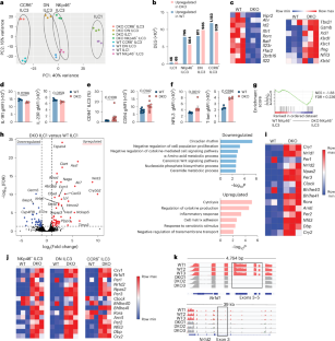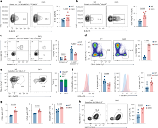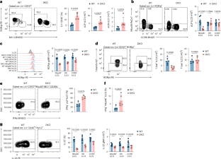 a, Volcano plot showing top 50 DEGs of NKp46 + ILC3s from WT and DKO mice (P value adjusted<0.05 and |Log2 Fold Change | > 1). Gene Ontology (GO) analysis of upregulated and downregulated DEGs in DKO NKp46 + ILC3s compared to WT cells. b, Volcano plot showing top 50 DEGs of DN ILC3s from WT and DKO mice (P value adjusted<0.05 and |Log2 Fold Change | > 1. GO analysis of upregulated and downregulated DEGs in DKO DN ILC3s compared to WT cells. c, Volcano plot showing top 50 DEGs of CCR6 + ILC3s from WT and DKO mice (P value adjusted<0.05 and |Log2 Fold Change | > 1). GO analysis of upregulated and downregulated DEGs in DKO CCR6 + ILC3s compared to WT cells. d, Heatmap of selected genes related to antigen presentation and MHC-II processing in bulk-RNA seq samples from WT and DKO CCR6 + ILC3s. e, Representative flow cytometry plot and quantification of CCR6 + MHCII+ ILC3s from WT and DKO mice (n = 4 per group). f, Quantification of pTregs and RORγt–Tregs in the siLP of WT and DKO mice (n = 5 per group). Results are representative of two independent experiments (e,f). FDR was determined by two-sided Wald test (DESeq2) for bulk RNA-seq analysis. Statistical analysis was performed using unpaired two-tailed Student’s t-test. Bars indicate means ( ± SEM).