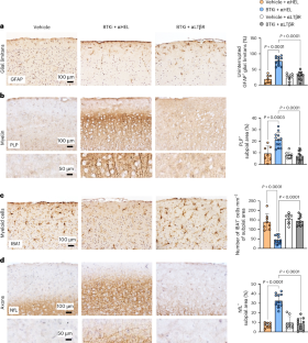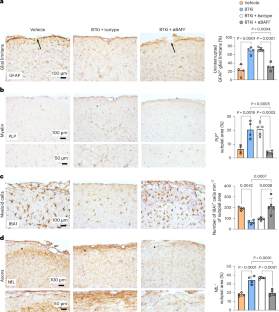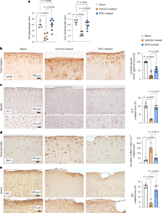 Immunohistochemical staining of somatosensory cortex tissue from naïve, therapeutically vehicle–treated and BTK inhibitor (BTKi)–treated SJL/J adoptive transfer EAE mice at peak disease (day 12 after adoptive transfer) for glial fibrillary acidic protein (GFAP) visualizing the glial limitans (a), proteolipid protein (PLP) visualizing myelin (b), ionized calcium binding adapter molecule 1 (IBA1) visualizing microglia and macrophages (c) and neurofilament light chain (NfL) visualizing axons (d). White arrowheads in a indicate the glial limitans; in c indicate microglia/macrophages.