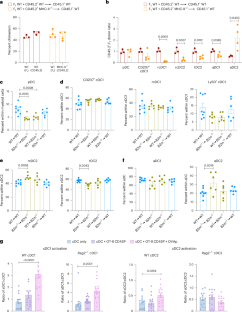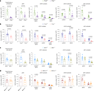 Extended Data Fig. 4 Thymic cDC1 and cDC2 homeostasis and activation depend on the presence of distinct thymocyte subsets.