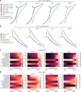 Related to Fig. 6. (a-c) Heatmaps show normalized expression (z-score) values of genes associated with the indicated pathways in cDC1s, cDC2s, aDC1s and aDC2s. Genes shown represent the union of differentially regulated genes identified via tradeSeq analysis along the p-Creode cDC1 and cDC2 differentiation trajectories from pairwise WT versus KO comparisons (Fig. 6c-d). Pathways were identified via gene enrichment analysis of the differentially regulated genes along the cDC1/cDC2 trajectories, carried out using WebgestaltR with pathways from KEGG and MSigDB databases.