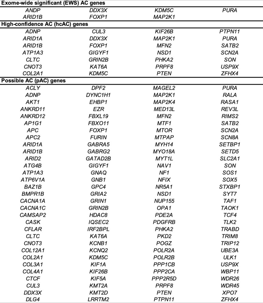 1. Exome-wide significant (EWS) genes include those genes surpassing multiple testing corrected significance thresholds for enrichment in protein-altering or protein-damaging DNVs. High-confidence AC (hcAC) genes include EWS genes plus those harboring two or more protein-altering DNVs with at least one damaging variant in predictive loss-of-function intolerant (pLI) genes (pLI score ≥ 0.9 in ExAC). Possible AC genes included EWS genes, hcAC genes, and those genes that harbored ≥ one damaging DNV with a pLI ≥ 0.9.