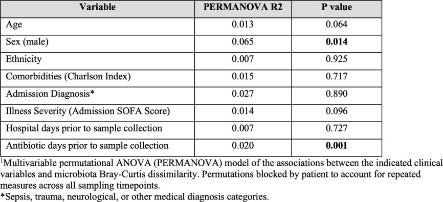 Extended Data Table 1 Multivariable analysis of clinical factors and their association with microbiota composition during the first week of ICU admission