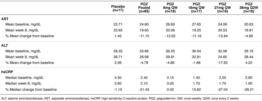 Extended Data Table 3 Effect of pegozafermin on markers of liver health and inflammation