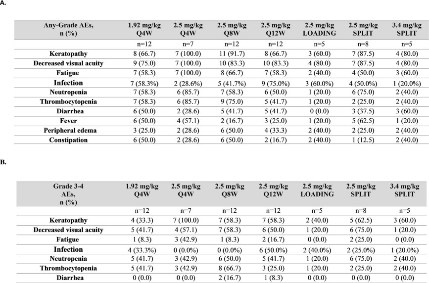 Extended Data Table 2 A. Any-Grade AEs Occurring in ≥20% of Patients by Dosing Cohort, Part 1; B. Grade 3-4 AEs Occurring in ≥5% of Patients by Dosing Cohort, Part 1