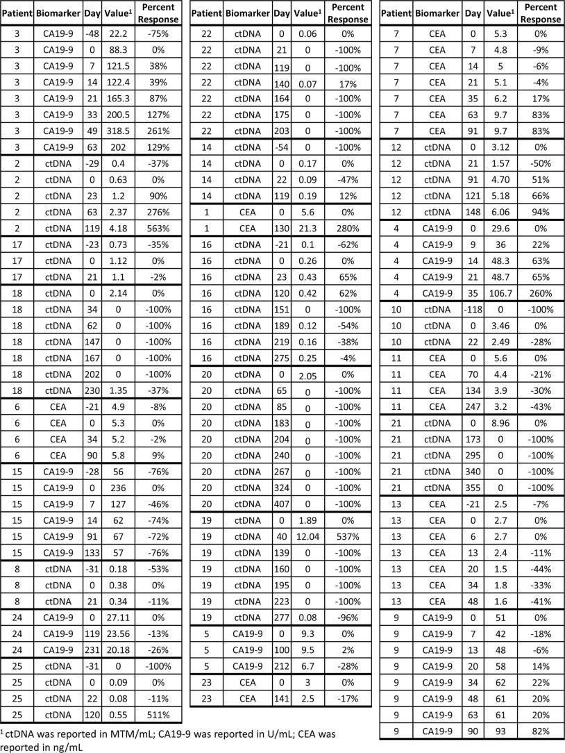 1. Longitudinal biomarker values for patients collected during screening, treatment and follow-up. ctDNA was reported in MTM/ml; CA 19-9 was reported in U ml−1; and CEA was reported in ng ml−1.