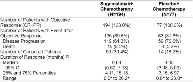 1. Duration of Response is defined as the time from the date of objective response to disease progression or death whichever occurs first. Patients without event (no disease progression or death) will be censored at the date of last tumor assessment.